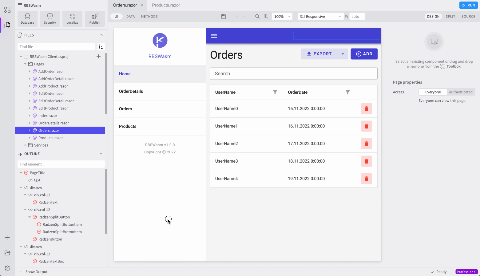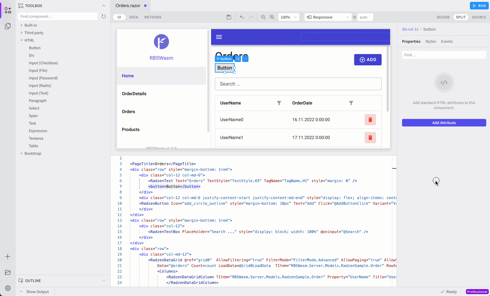 Radzen Blazor Studio makes it easy to add and manage Blazor components and HTML elements through its visual designer.