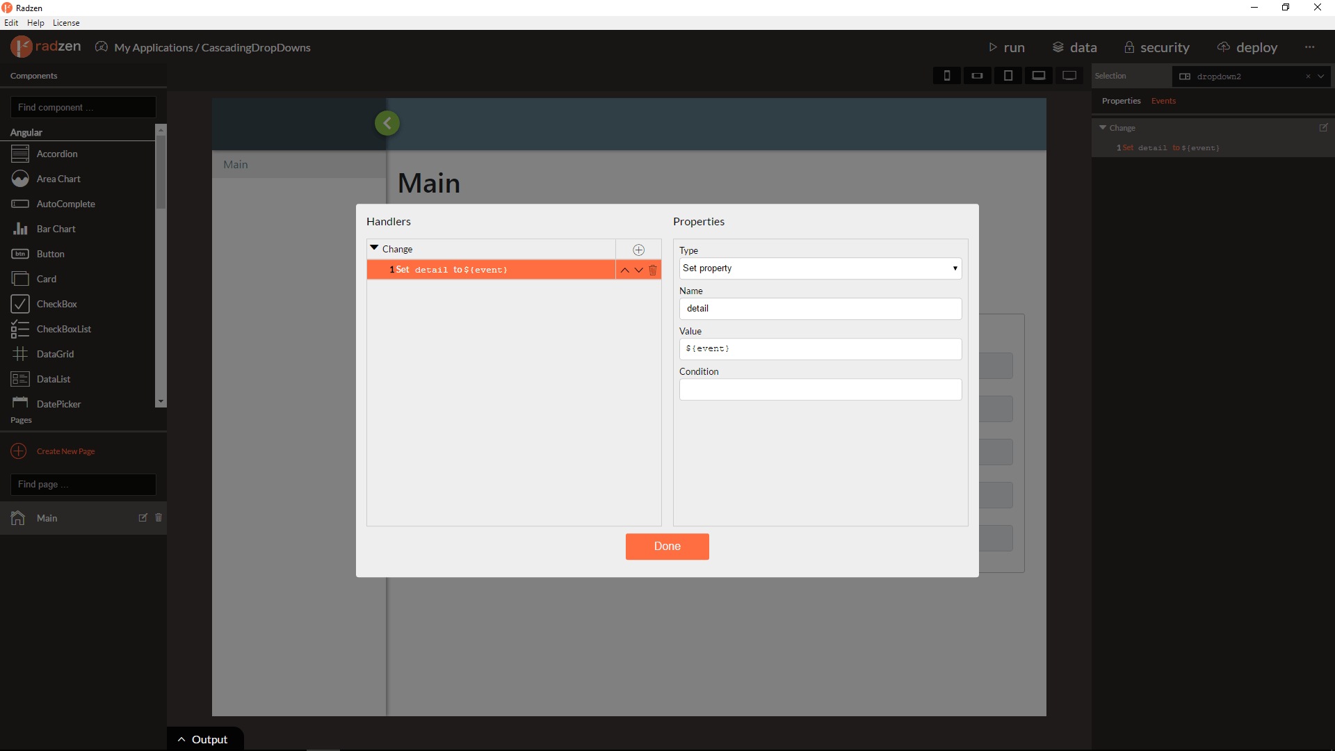 getOrderDetails() on second DropDown Change event with OrderID parameter equal to ${event.OrderID} and set details Page property equal to ${result.value}: