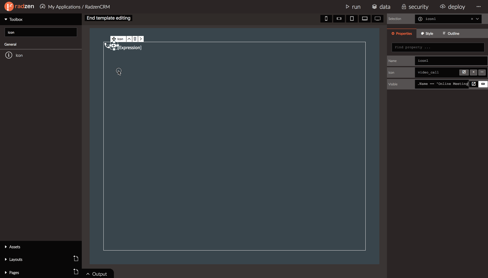 . Go to the Style tab of the property grid and set VerticalAlign to middle.video_call and set the Visible property to ${data.TaskType.Name == 'Online Meeting'}.