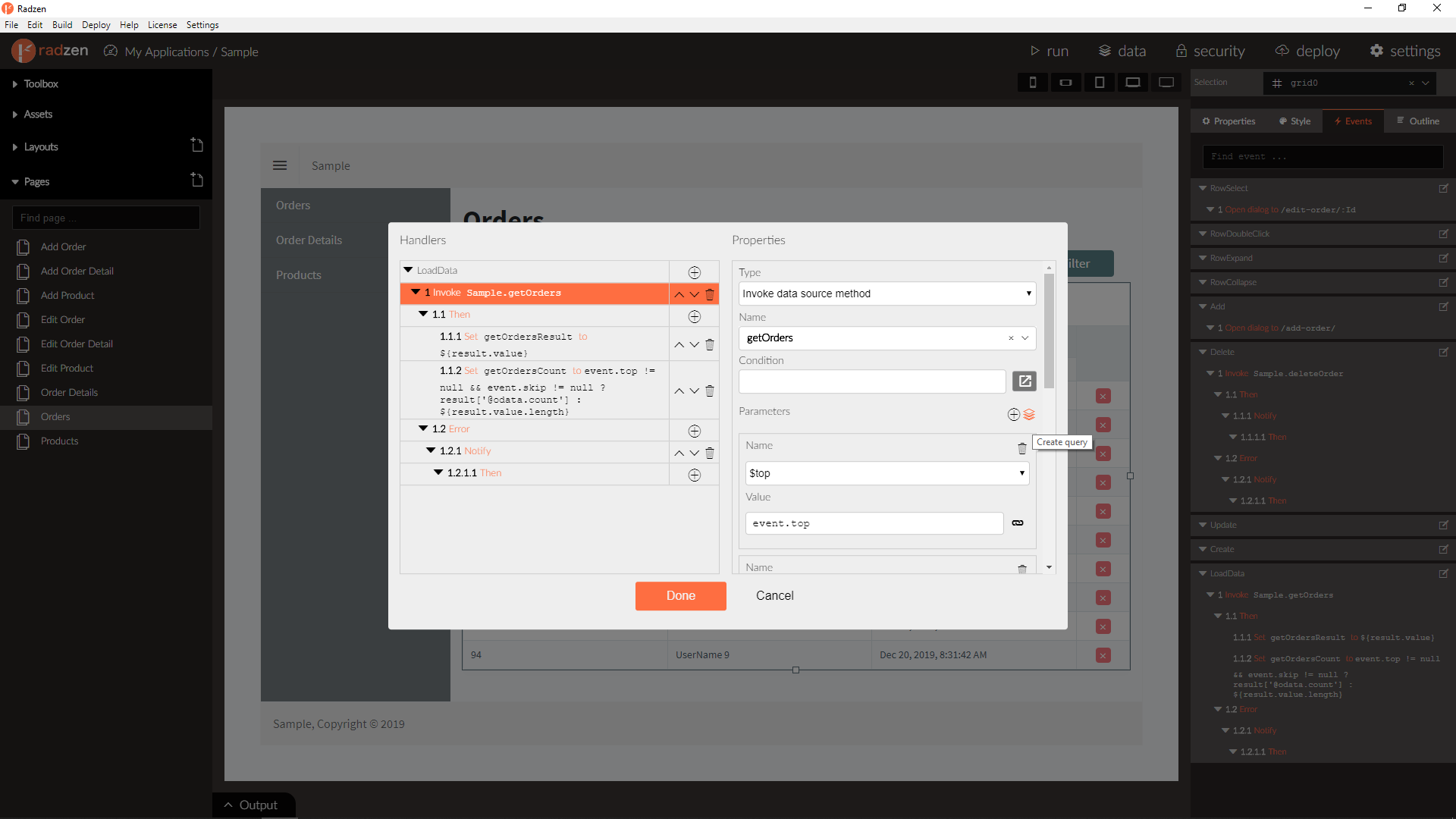 4. Open query builder for DataGrid component LoadData event invoke getOrders() method and create filter using start and end properties with following expression ${event.filter} and ${(<any>this).filter(this.start, this.end)}.
