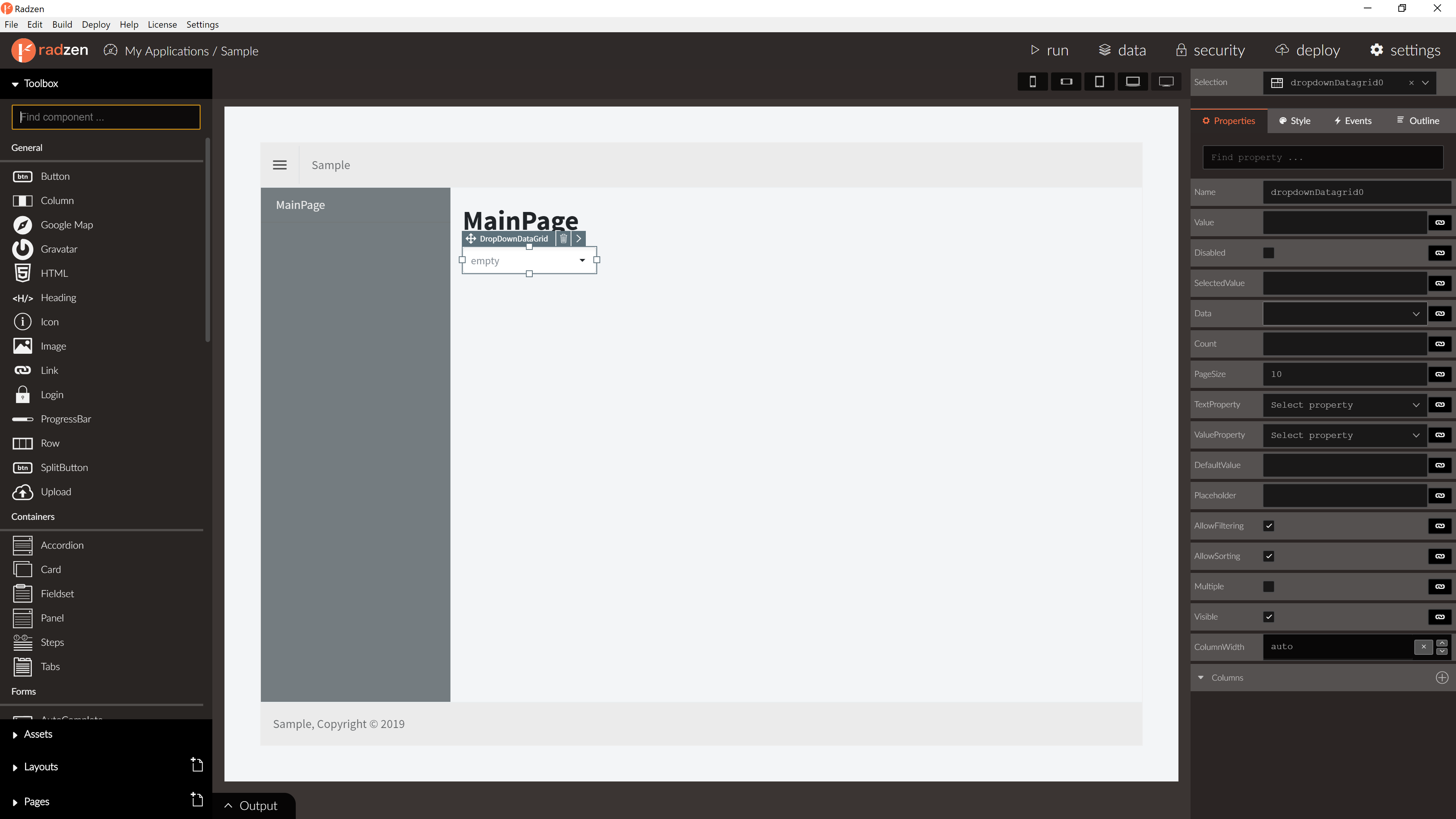 | Visible | boolean/expression | true | Is DropDownDataGrid visible. |