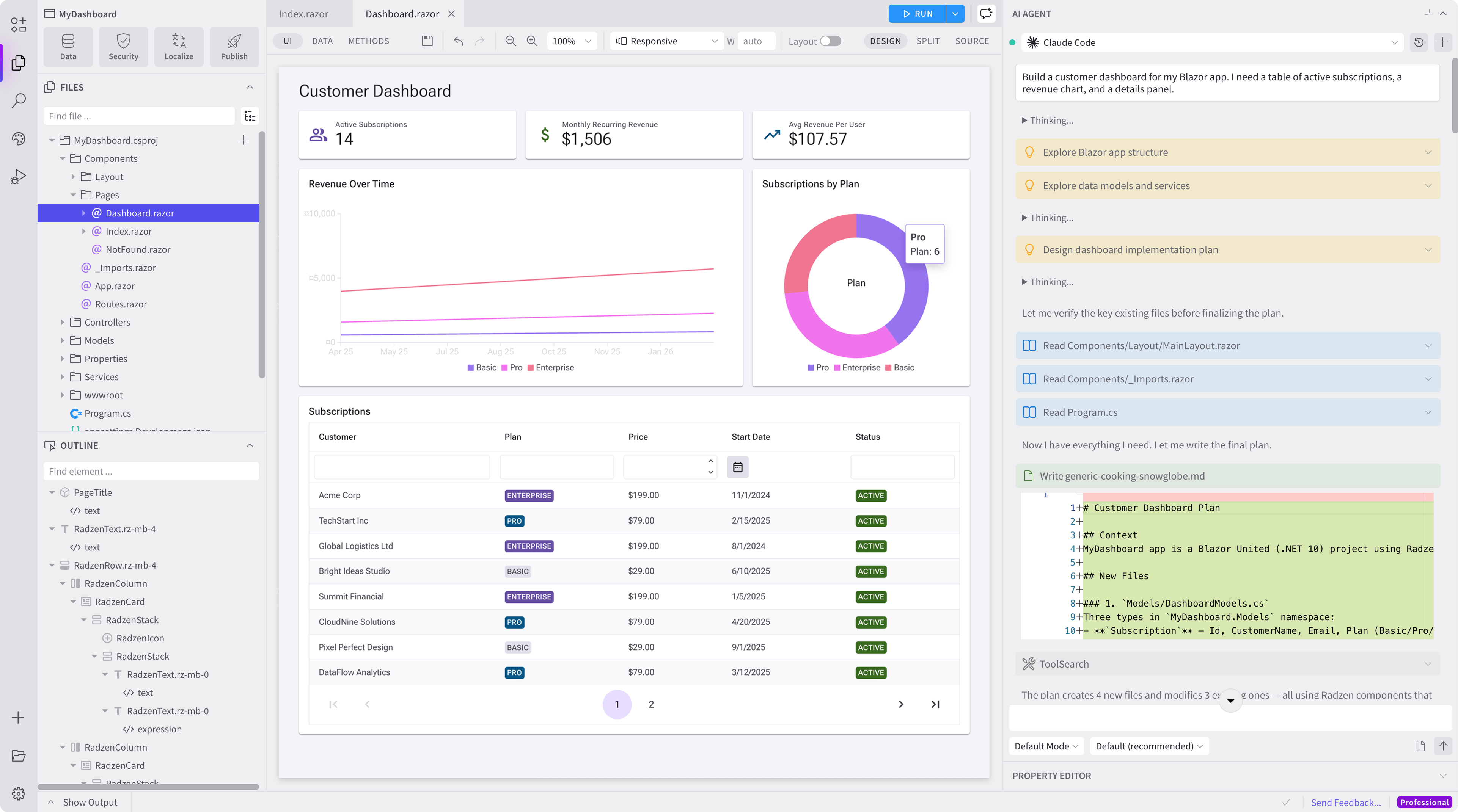 When you use an AI agent through Radzen Blazor Studio, Radzen Blazor MCP is automatically configured — no manual setup needed. The agent gets access to Radzen Blazor component documentation, API details, and ready-made templates out of the box.