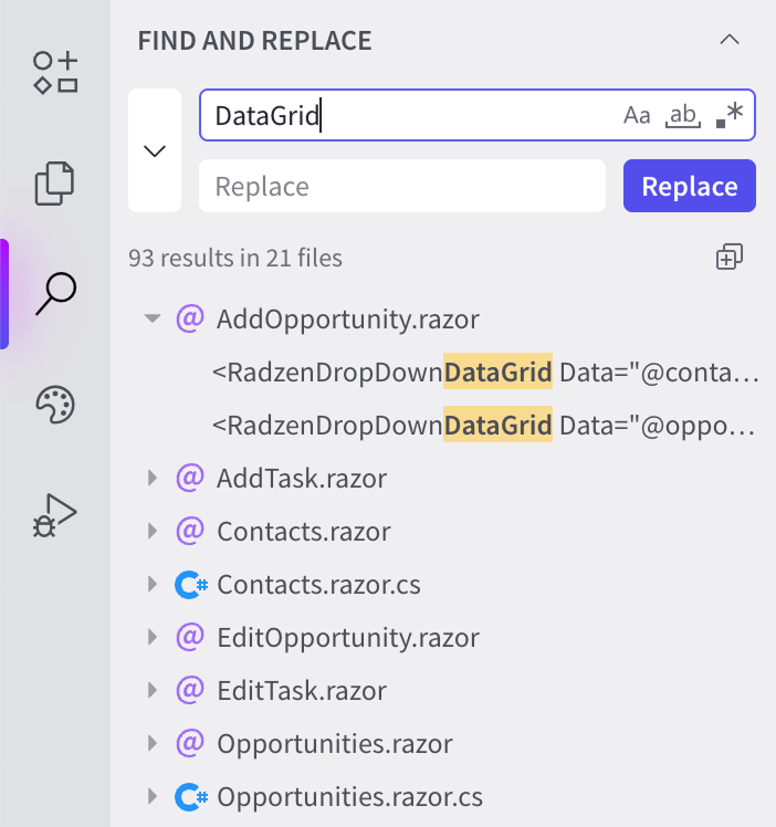 Allows you to search for text across your project and replace it in one or multiple files. Use it to quickly locate code, rename identifiers, or update values throughout your application.
